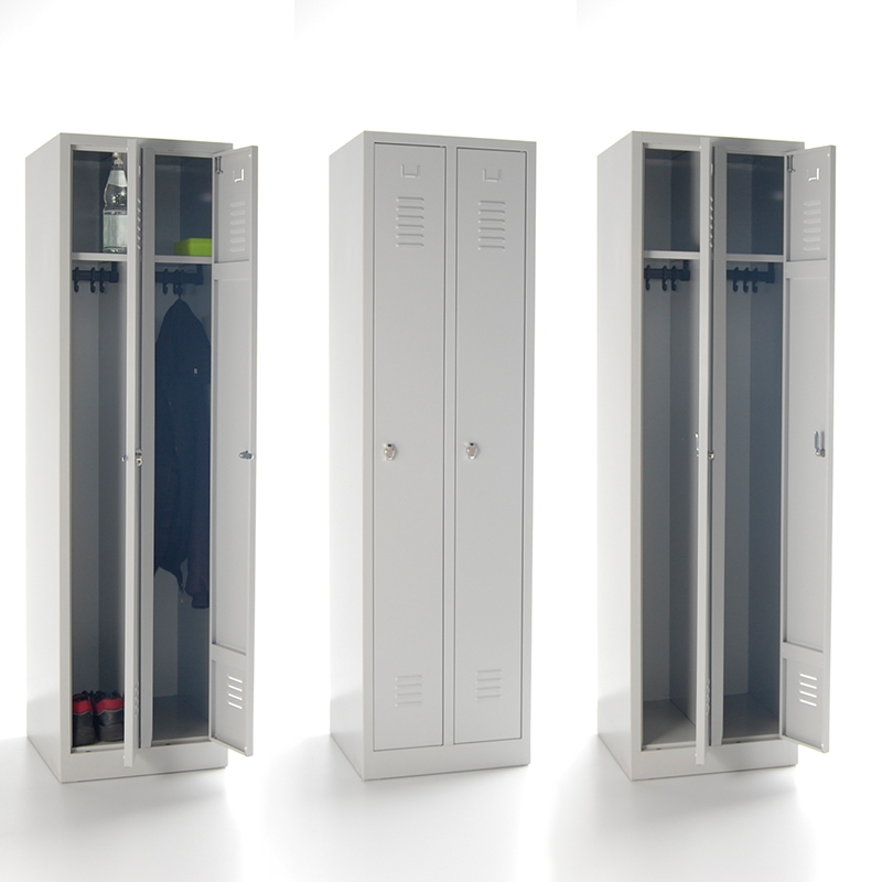 Abteile mit je einem Hutboden und Metallkleider-Stange mit drei verschiebbaren Kleiderhaken aus Kunststoff. Einschlagende Türen mit innenliegenden Scharnieren. Verschließbar durch Zylinderschloß mit 2 Schlüsseln.